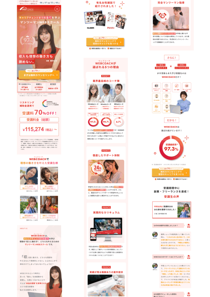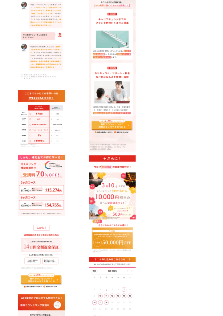 ランディングページ制作 2025年9月2日 最終更新日時 : 2025年9月2日 aki.rain 【製作時間】20時間【使用ソフト】Photoshop・illustrator・Figma・HTML・CSS・jquery【担当業務】デザイン・実装【意識した亊】スクロール離脱を防ぐためjqueryで動きをつけたLPを作成しました。